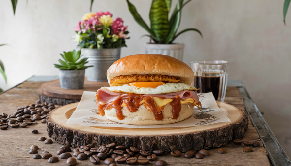 Honey glazed ham, old english cheese, hashy, fried egg. In BBQ or tomato sauce